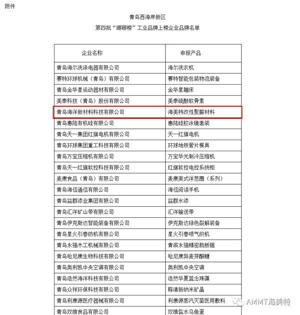 青島海洋新材料以自主研發(fā)的“海美特改性聚脲材料”申報青島西海岸新區(qū)第四批“瑯琊榜”工業(yè)品牌評選活動,經(jīng)過層層評選,榮獲“瑯琊榜”工業(yè)品牌企業(yè)榮譽稱號。此榮譽的獲得,是對海美特企業(yè)實力和產(chǎn)品技術的肯定。