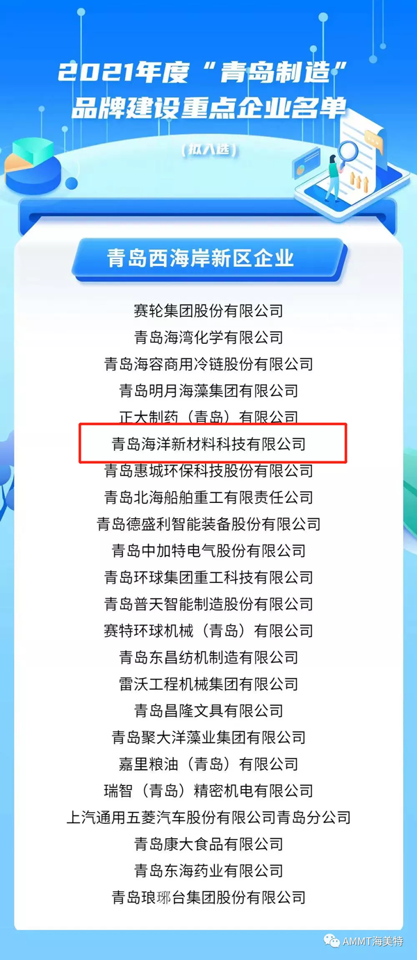 青島海洋新材料科技有限公司成功入圍市工信局組織開(kāi)展的2021年度“青島制造”品牌建設(shè)重點(diǎn)企業(yè)名單。此次入選2021年度“青島制造”品牌建設(shè)重點(diǎn)企業(yè)名單共124家,其中西海岸新區(qū)入選企業(yè)23家。