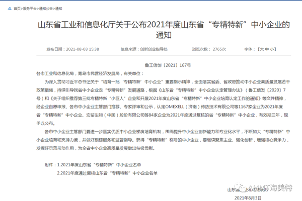 2021年8月,青島海洋新材料科技有限公司(AMMT海美特)獲批2021年度山東省“專精特新”中小企業(yè)榮譽(yù)稱號(hào)!