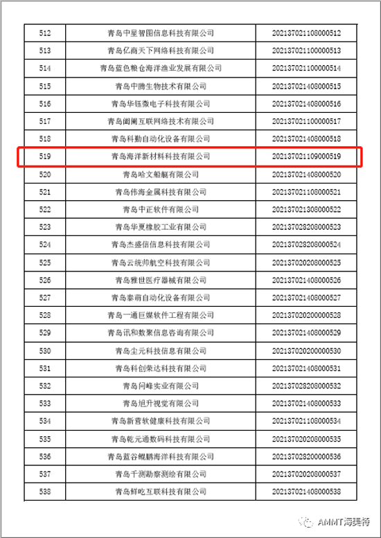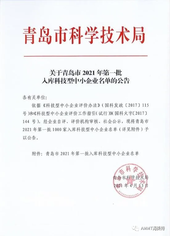 根據(jù)《科技型中小企業(yè)評(píng)價(jià)辦法》(國科發(fā)政[2017]115號(hào))和《科技型中小企業(yè)評(píng)價(jià)工作指引(試行)》(國科火字[2017]144號(hào))要求,青島海洋新材料科技有限公司經(jīng)政府有關(guān)部門批準(zhǔn)入庫成為“科技型中小企業(yè)”。這是我公司在提高企業(yè)自主創(chuàng)新能力、走創(chuàng)新持續(xù)發(fā)展道路上取得的又一喜人成果。