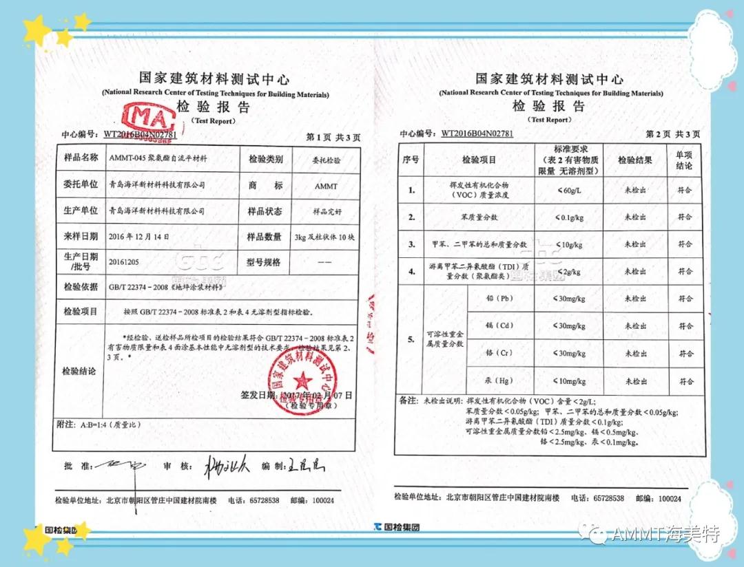 AMMT無溶劑系列產品由異氰酸酯預聚物、改性多元醇樹脂、擴鏈劑、填料和助劑組成的雙組份材料,綠色環(huán)保,極低VOC。目前主要產品有:AMMT-045無溶劑聚氨酯地坪材料(包括自流平、防靜電自流平、砂漿自流平等類型地坪材料)、AMMT-046無溶劑聚脲自流平地坪材料、AMMT-019無溶劑聚氨酯底漆、AMMT-326無溶劑環(huán)氧底漆等。AMMT無溶劑系列產品經過權威機構檢測均達到新標準環(huán)保要求。