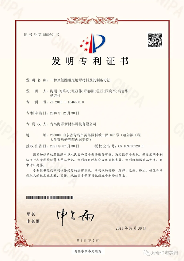 2021年7月30日,青島海洋新材料科技有限公司申請的《一種聚氨酯阻尼地坪材料及其制備方法》發(fā)明專利獲得國家知識產權局授權,授權專利號:ZL 2018 1 1646380.0。目前,公司共獲得國家授權專利33項,其中發(fā)明專利31項,實用新型專利1項,外觀設計專利1項。